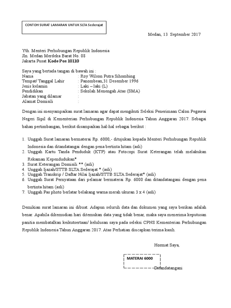 Contoh Surat Lamaran Dan Pernyataan Cpns Kemenhub 2018